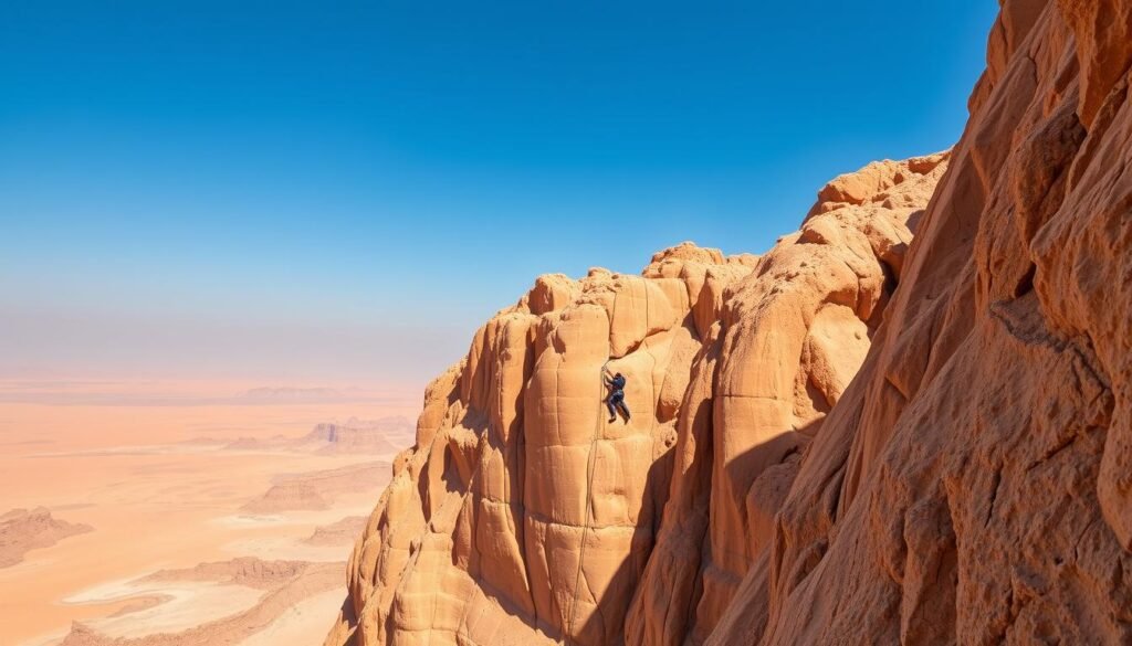 For those looking for a big challenge, the Tuwaiq Mountains in central Kingdom Land are ideal. These limestone mountains have tough routes that test your skills. Experienced climbers will love the steep walls and technical climbs.